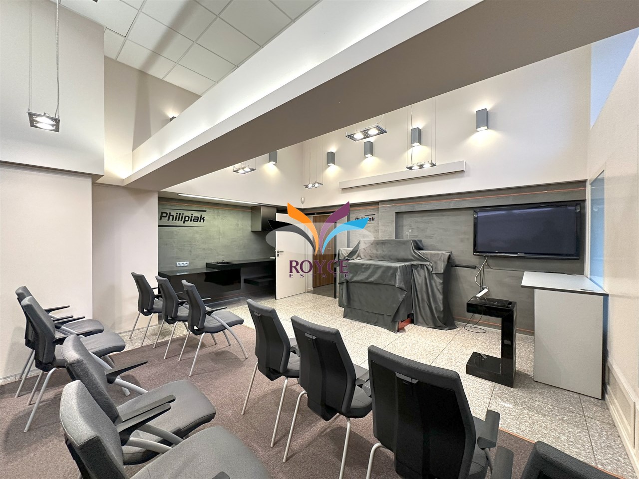 Parter lokalu to 191,77 m2, składa się z sali sprzedaży, sali konferencyjnej, zaplecza biurowo-socjalnego (pokój biurowy, dwie toalety, pomieszczenie socjalne, korytarz) - wysokość 5 m